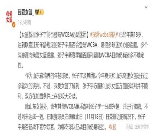 2025-26赛季,张子宇终于年满18岁了,这一次,她终于达到了征战职业联赛的要求。这下,终于没有任何理由可以阻挡这个小巨人进入职业联赛了。然而,根据知情人士透露,张子宇目前还未确定能否出战新赛季。据悉,她与山东队在签约问题上存在比较大的分歧,双方暂时还没有签约。而且,也不少球队对于张子宇感兴趣,并且向她伸出橄榄枝,希望她能够加盟。