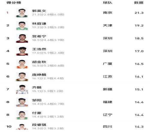 连克北京上海,国内球员得分榜前五占俩,贺希宁王浩然太猛了