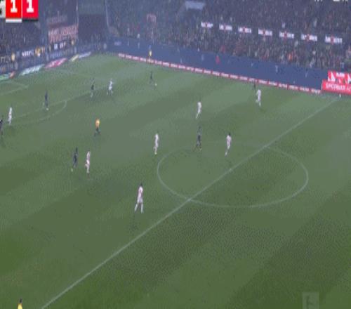 上半时补时阶段,拜仁快速回应,站出来的正是前面刚失误导致丢球的格纳布里,拜仁后场快攻转移右侧,奥利斯插上接球突入禁区横传中路,格纳布里接球直接往前一挑人球分过摆脱防守,小角度大力抽射,皮球直入球门近端死角,拜仁半场结束前1:1扳平比分。易边再战拜仁继续加强进攻,第53分钟,格纳布里插上禁区左侧获得小角度不错的机会,只是他凌空扫射踢呲了错失良机。2分钟后科隆这边反击也制造闪击,只是卡明斯基无法摆脱韩国球员金玟哉,最后被金玟哉将球断走。